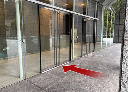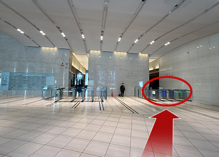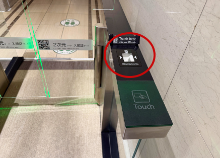 担当者より発行されたQRコードを、一番右(緑に光っています)のフラッパーゲートのQR読み取り口にかざします。ゲートが開いたらそのまま入館してください