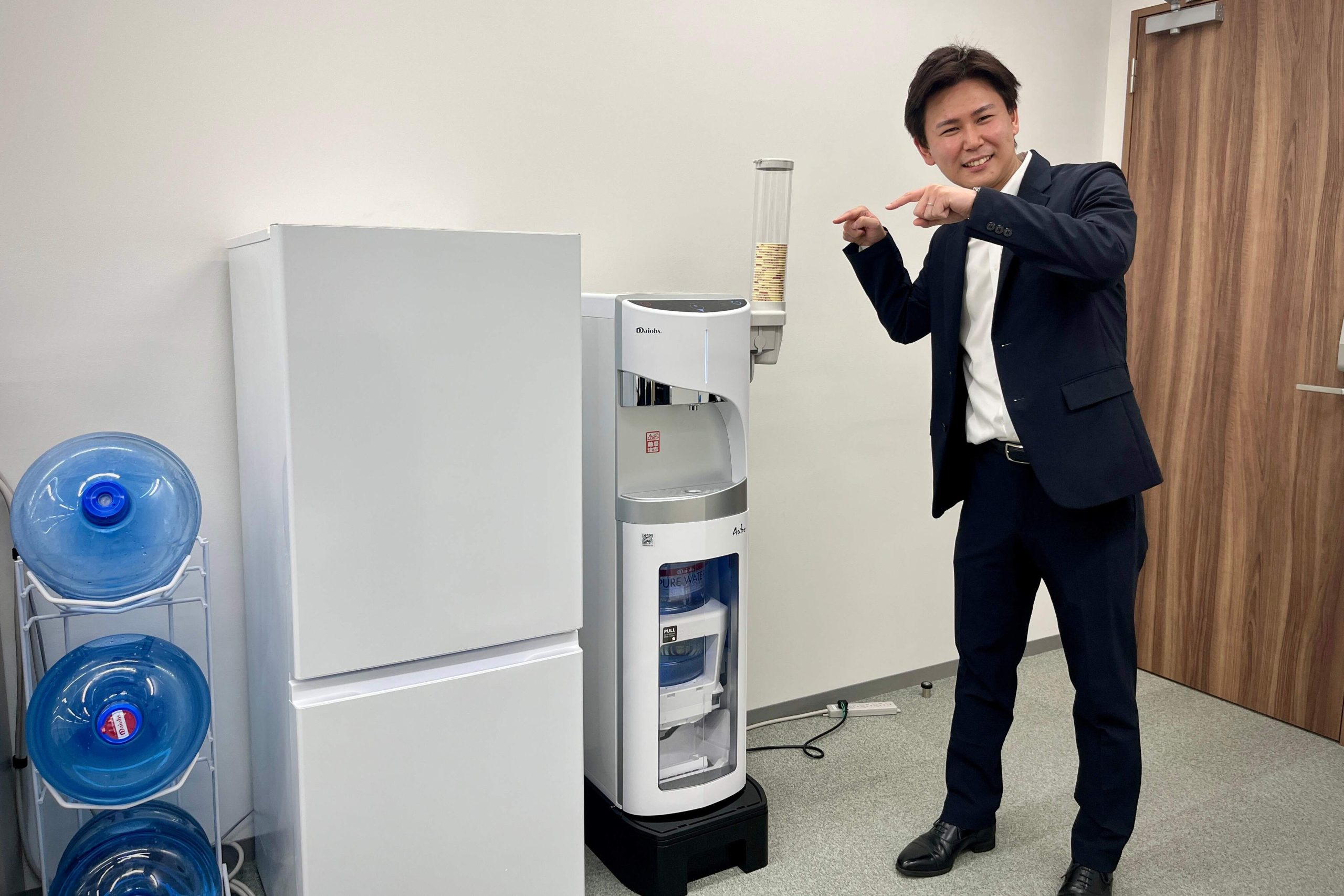 「なんといっても白色は空間を広く感じさせる色なんです。作業スペースが広々と感じられるように、冷蔵庫や給水機なども含め、白を基調としたオフィスにしました!」